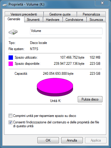 Una volta rilevato il drive in Windows 7 il sistema riconosce 223GB disponibili.